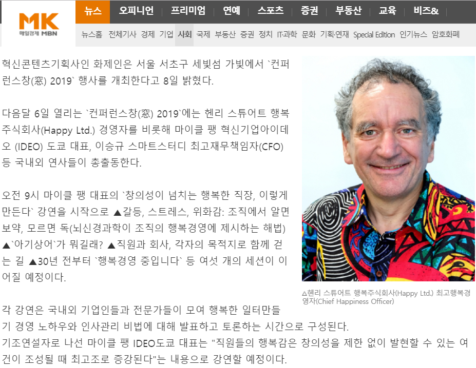 `행복한 일터 만들기`…다음달 6일 `컨퍼런스창 2019` 개최헨리 스튜어트 행복주식회사(Happy Ltd.) 경영자 등 전문가 연사 참여입력 : 2019.08.08 11:43:32수정 : 2019.08.08 14:23:18헨리 스튜어트 행복주식회사(Happy Ltd.) 최고행복경영자(Chief Happiness Officer)
