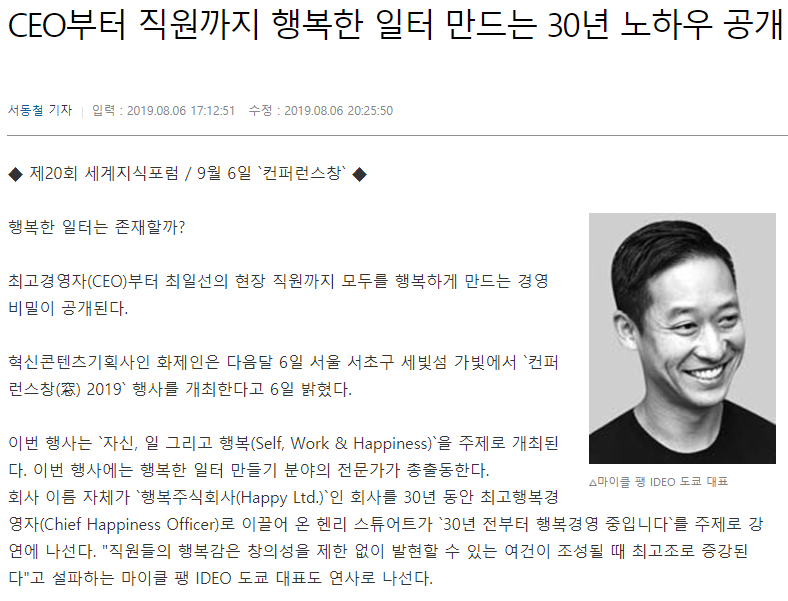 ◆ 제20회 세계지식포럼 / 9월 6일 `컨퍼런스창` ◆마이클 팽 IDEO 도쿄 대표행복한 일터는 존재할까?최고경영자(CEO)부터 최일선의 현장 직원까지 모두를 행복하게 만드는 경영 비밀이 공개된다.